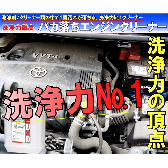 バカ落ちエンジンクリーナー 4L アルカリ性の強力洗浄剤です。 トップクラスの洗浄力と、スプレーするだけという簡単な作業性から様々な業界のプロの皆様に使っていただいております。 エンジンルームに限らず、酷い汚れや油汚れにお困りの方には 車用エンジンクリーナーは油汚れをスッキリ取る溶剤がほとんどですので、 容量や値段、利用シーンで選ぶ とよいでしょう。 容量で選ぶ 車用エンジンクリーナーは、1回分の清掃にぴったりな量から約lの業務用まで販売されています。エンジンルームメンテナンストップ エンジンオイル エンジン内部洗浄剤(エンジンフラッシング) エンジン燃焼室クリーナー(カーボン除去) スパークプラグ バッテリー エンジン内部を洗浄することで本来の動きに改善し、燃費やバワーを回復させる